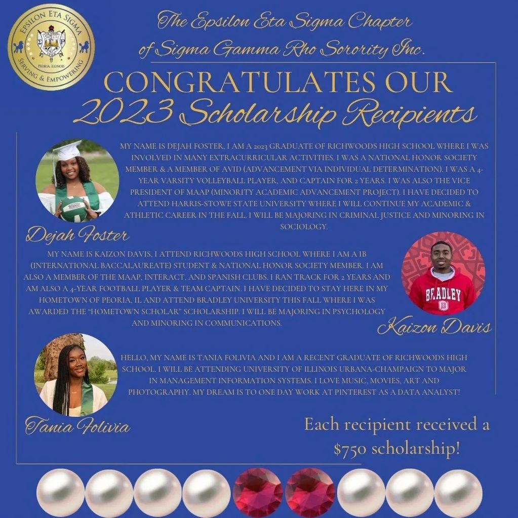 The Elegant Ladies of Epsilon Eta Sigma Chapter are proud to present our 2023 Scholarship Recipients! As our Founders were educators, we believe that it's important to continue to uplift our youth and to support them in their pursuit of higher education. Please join us in congratulating our recipients!